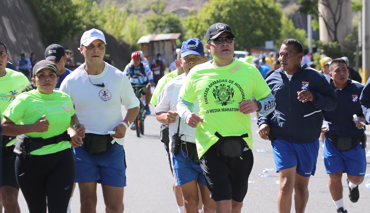 Tegucigalpa, 23 de octubre. La Sexta Media Maratón Fuerzas Armadas Corriendo Por La Salud, que se realizó hoy a beneficio de organizaciones que trabajan por la salud, muestra el rostro humano de la institución militar, dijo el presidente Juan Orlando Hernández, quien encabezó la jornada deportiva.
