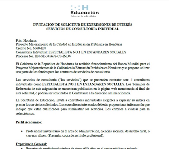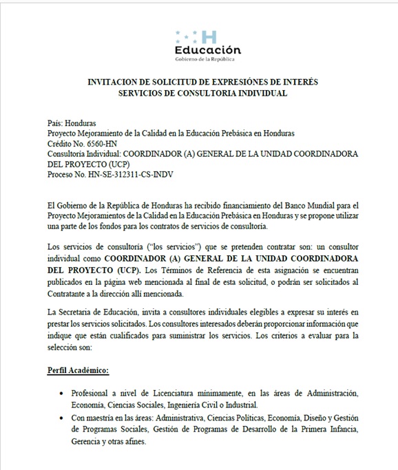 - Ente ejecutor: Secretaria de Educación de Honduras.